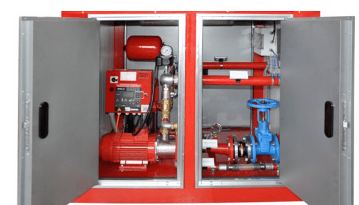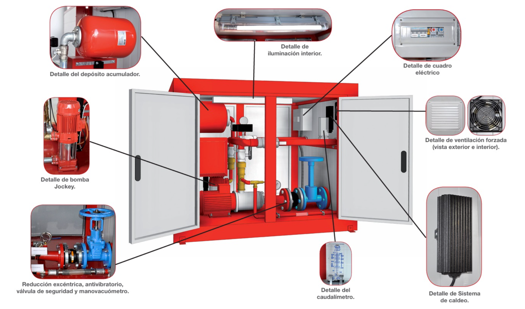 El equipo FIRE BOX ofrece un diseño muy compacto compuesto por una estructura modular fabricada en panel de chapa tipo sándwich (habitáculo resistente al fuego durante 60 min. EI60 de acuerdo a normativa 23500) y en cuyo interior se aloja el equipo de bombeo y, por tanto, es muy adecuado para instalarse en todas aquellas ubicaciones donde el principal requisito sea el mínimo espacio.