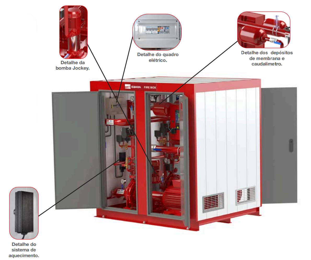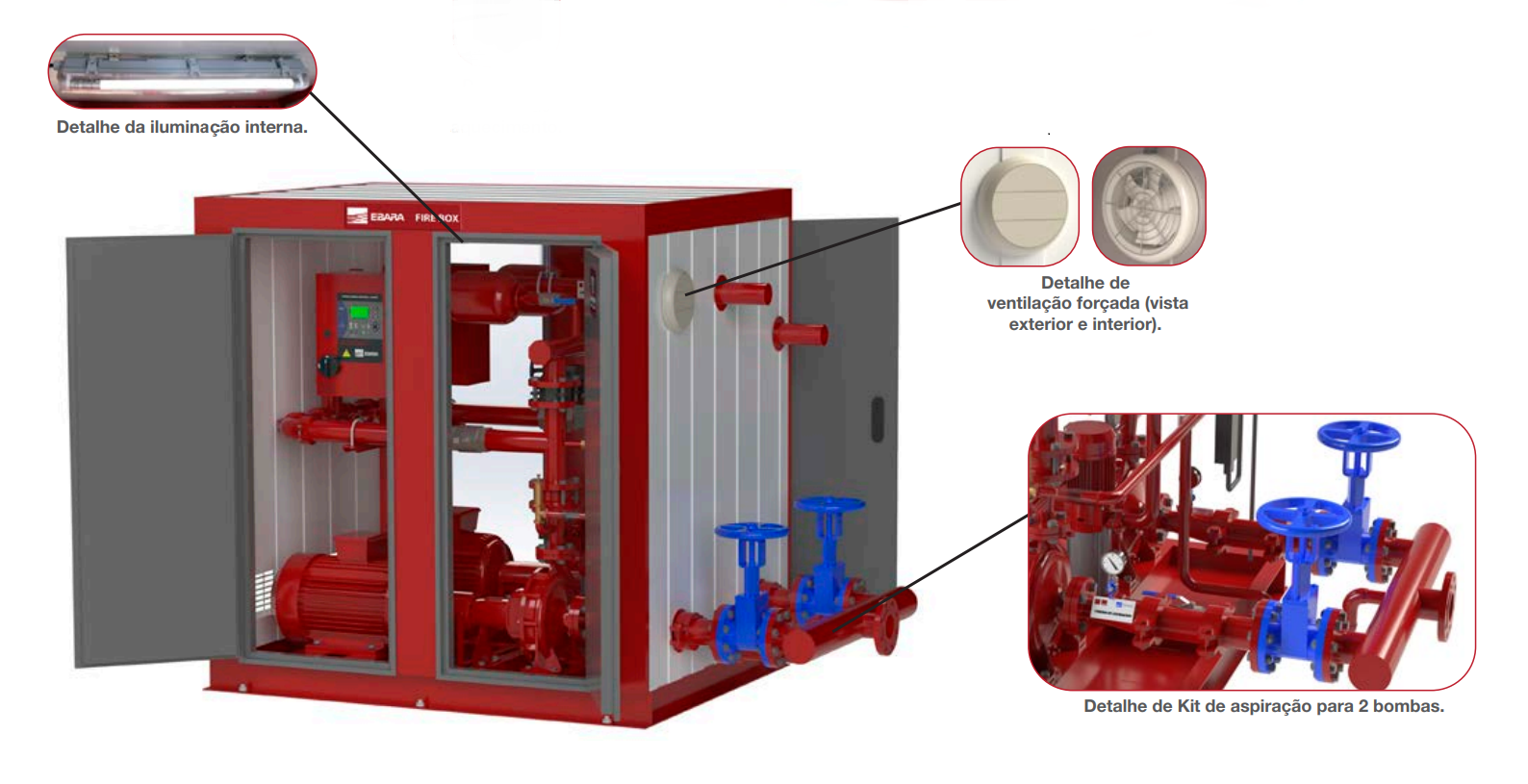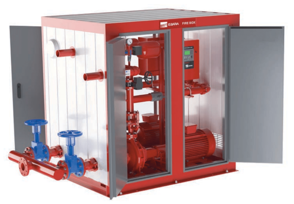 El equipo FIRE BOX ofrece un diseño muy compacto compuesto por una estructura modular fabricada en panel de chapa tipo sándwich (habitáculo resistente al fuego durante 60 min. de acuerdo a normativa 23500) y en cuyo interior se aloja el equipo de bombeo y, por tanto, es muy adecuado para instalarse en todas aquellas ubicaciones donde el principal requisito sea el mínimo espacio.